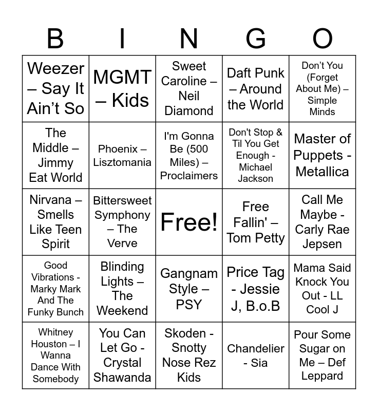 This bingo card has a free space and 75 words: Summer of '69 – Bryan Adams, Satisfaction – Rolling Stones, Sweet Caroline – Neil Diamond, Hurts So Good – John Mellencamp, Glory Days – Bruce Springsteen, Sweet Child O' Mine – Guns N Roses, Beautiful Day – U2, Livin' On A Prayer – Bon Jovi, Sweet Home Alabama – Lynyrd Skynyrd, Fortunate Son - Creedence Clearwater Revival, I Love Rock 'N Roll - Joan Jett & the Blackhearts, I Still Haven't Found What I'm Looking For - U2, I'm Gonna Be (500 Miles) – Proclaimers, The Middle – Jimmy Eat World, Tubthumping – Chumbawamba, Bittersweet Symphony – The Verve, Never Gonna Give You Up – Rick Astley, Pour Some Sugar on Me – Def Leppard, Sweet Dreams – Eurythmics, Don’t You (Forget About Me) – Simple Minds, Sabotage - Beastie Boys, Nirvana – Smells Like Teen Spirit, Phoenix – Lisztomania, MGMT – Kids, Daft Punk – Around the World, Outkast – Hey Ya, Cardigans – LoveFool, Blondie – Heart of Glass, Beyoncé – Single Ladies, Michael Jackson – Beat it, You Belong With Me - Taylor Swift, Just Dance - Lady Gaga, Can't Stop the Feeling - Justin Timberlake, Price Tag - Jessie J, B.o.B, Master of Puppets - Metallica, Don't Stop & Til You Get Enough - Michael Jackson, Party in the U.S.A. - Miley Cyrus, Don't Stop Me Now - Queen, Call Me Maybe - Carly Rae Jepsen, Chandelier - Sia, Journey – Don’t Stop Believin’, Backstreet Boys – I Want It That Way, Village People – Y.M.C.A., Bruno Mars – Uptown Funk, Pharrell Williams – Happy, Taylor Swift – Shake It Off, Whitney Houston – I Wanna Dance With Somebody, Weezer – Say It Ain’t So, John Denver – Take Me Home, Country Roads, The Foundations – Build Me Up, Buttercup, Butter – BTS, Gangnam Style – PSY, Blank Space – Taylor Swift, Dancing Queen – ABBA, Don’t Stop Me Now – Queen, Your Song – Elton John, Twist and Shout – The Beatles, I Will Always Love You – Whitney Houston, Wake Me up Before You Go-Go – Wham!, My Girl – The Temptations, Blinding Lights – The Weekend, Dirty Laundry - Don Henley, I Gotta Feeling - Black Eyed Peas, A Little Less Conversation - Elvis vs JXL, The Power of Love – Huey Lewis & the News, Free Fallin' – Tom Petty, People Are Strange – The Doors, Hot in the City – Billy Idol, Dog Days Are Over – Florence and the Machine, Mama Said Knock You Out - LL Cool J, Good Vibrations - Marky Mark And The Funky Bunch, You Can Let Go - Crystal Shawanda, Devil Come Down Sunday - Derek Miller, Skoden - Snotty Nose Rez Kids and Stadium Pow Wow - The Halluci Nation, Black Bear.