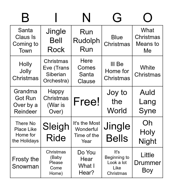 This bingo card has a free space and 24 words: Sleigh Ride, Christmas (Baby Please Come Home), Here Comes Santa Clause, Frosty the Snowman, What Christmas Means to Me, Santa Claus Is Coming to Town, Holly Jolly Christmas, Jingle Bell Rock, Joy to the World, It's the Most Wonderful Time of the Year, Ill Be Home for Christmas, Grandma Got Run Over by a Reindeer, Jingle Bells, Oh Holy Night, Christmas Eve (Trans Siberian Orchestra), It's Beginning to Look a lot Like Christmas, Auld Lang Syne, Run Rudolph Run, White Christmas, Happy Christmas (War is Over), Little Drummer Boy, There No Place Like Home for the Holidays, Blue Christmas and Do You Hear What I Hear?.