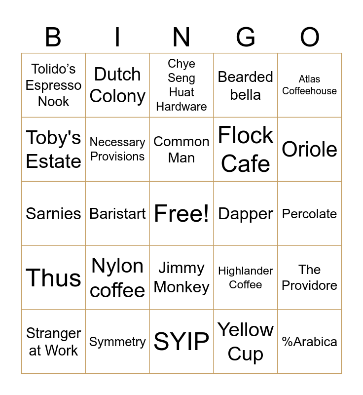 This bingo card has a free space and 24 words: Nylon coffee, Symmetry, Common Man, Stranger at Work, Atlas Coffeehouse, Tolido’s Espresso Nook, Toby's Estate, Dutch Colony, Dapper, Jimmy Monkey, Flock Cafe, Sarnies, Highlander Coffee, The Providore, Necessary Provisions, Yellow Cup, Percolate, Chye Seng Huat Hardware, Oriole, Baristart, %Arabica, Thus, Bearded bella and SYIP.