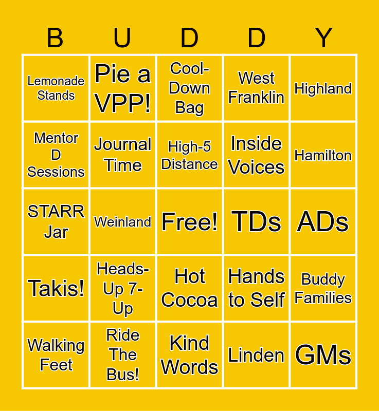 This bingo card has a free space and 24 words: Heads-Up 7-Up, Ride The Bus!, High-5 Distance, Walking Feet, Highland, Lemonade Stands, Mentor D Sessions, Pie a VPP!, TDs, Hot Cocoa, Inside Voices, STARR Jar, Hands to Self, Buddy Families, Journal Time, Linden, ADs, Cool-Down Bag, Hamilton, Weinland, GMs, Takis!, West Franklin and Kind Words.