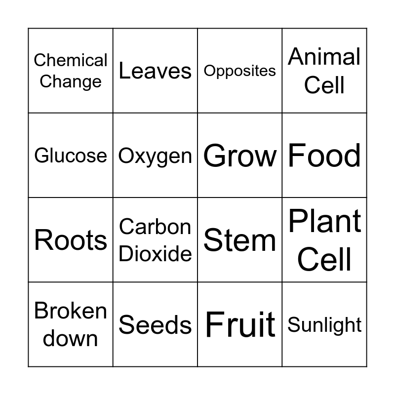 This bingo card has 24 words: Energy, Chlorophyll, Food, Photosynthesis, Glucose, Chemical Change, Oxygen, Leaves, Seeds, Flowers, Roots, Stem, Thermal Energy, Mitochondria, Grow, Cellular Respiration, Fruit, Opposites, Carbon Dioxide, Plant Cell, Broken down, Sunlight, Animal Cell and Water.