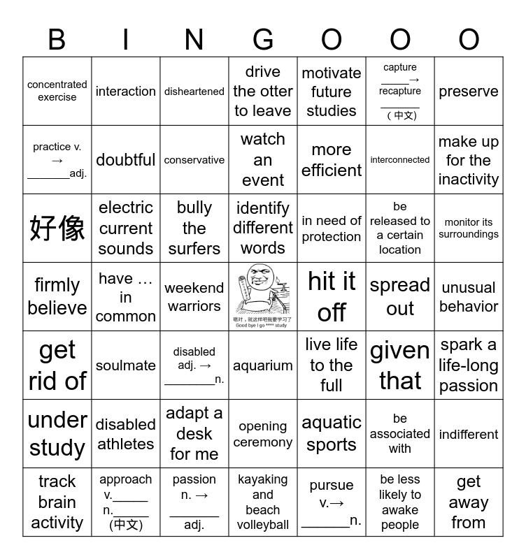 This bingo card has a free space and 48 words: aquatic sports, interconnected, kayaking and beach volleyball, have …in common, bully the surfers, unusual behavior, interaction, approach v._____ n._____ (中文), capture _____→ recapture _______ (中文), aquarium, preserve, drive the otter to leave, be released to a certain location, in need of protection, under study, spread out, practice v. → _______adj., make up for the inactivity, be associated with, motivate future studies, more efficient, weekend warriors, concentrated exercise, doubtful, indifferent, conservative, monitor its surroundings, track brain activity, identify different words, electric current sounds, be less likely to awake people, hit it off, spark a life-long passion, disabled athletes, firmly believe, live life to the full, given that, 好像, disabled adj. → ________n., adapt a desk for me, get rid of, get away from, disheartened, passion n. → _______ adj., watch an event, opening ceremony, soulmate and pursue v.→ ______n..