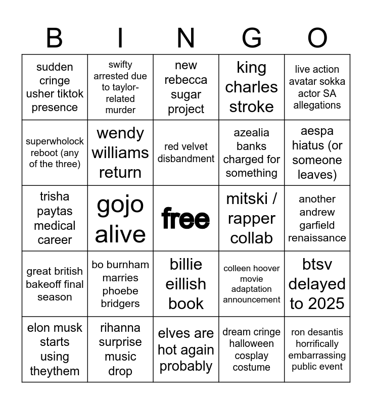 This bingo card has a free space and 24 words: bo burnham marries phoebe bridgers, rihanna surprise music drop, red velvet disbandment, elon musk starts using theythem, live action avatar sokka actor SA allegations, sudden cringe usher tiktok presence, superwholock reboot (any of the three), swifty arrested due to taylor-related murder, mitski / rapper collab, billie eillish book, azealia banks charged for something, trisha paytas medical career, colleen hoover movie adaptation announcement, btsv delayed to 2025, wendy williams return, dream cringe halloween cosplay costume, another andrew garfield renaissance, new rebecca sugar project, aespa hiatus (or someone leaves), gojo alive, ron desantis horrifically embarrassing public event, great british bakeoff final season, king charles stroke and elves are hot again probably.