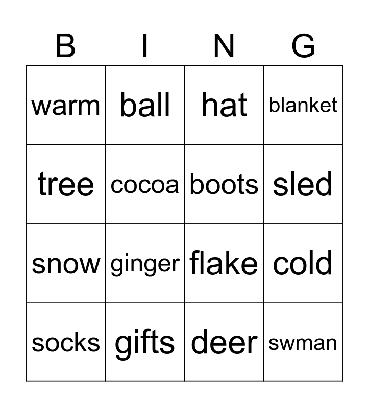 This bingo card has 20 words: cold, winter, hat, coat, socks, tree, gifts, warm, snow, ball, ginger, flake, cocoa, swman, boots, candy, sled, blanket, deer and gloves.
