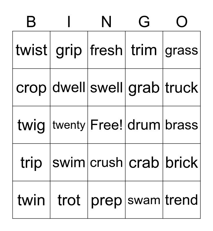 This bingo card has a free space and 27 words: crab, drag, grab, prep, crop, fresh, grip, trip, drum, brick, twig, trim, twin, trot, truck, twang, dwell, swell, swim, twist, brass, swam, twenty, trend, crush, grass and grin.