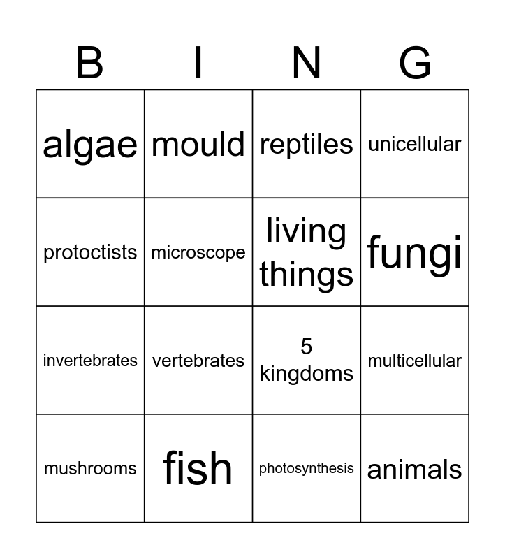 This bingo card has 23 words: animals, plants, fungi, bacteria, protoctists, algae, microscope, mould, mushrooms, yeast, vertebrates, invertebrates, mammals, birds, fish, amphibians, reptiles, 5 kingdoms, living things, multicellular, unicellular, photosynthesis and protozoa.