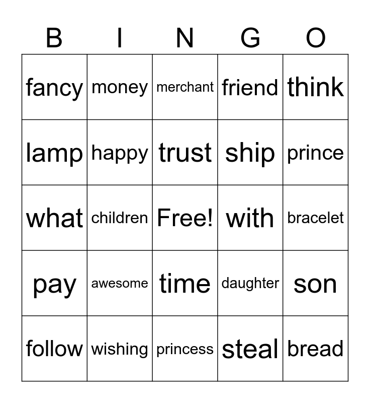 This bingo card has a free space and 24 words: awesome, wishing, trust, follow, think, fancy, lamp, money, with, time, ship, what, daughter, son, happy, steal, bracelet, merchant, prince, children, bread, pay, friend and princess.