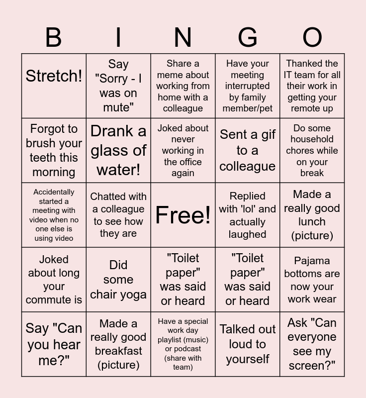 This bingo card has a free space and 25 words: Say "Can you hear me?", Did some chair yoga, Joked about never working in the office again, Talked out loud to yourself, Do some household chores while on your break, Stretch!, Say "Sorry - I was on mute", Share a meme about working from home with a colleague, Sent a gif to a colleague, Pajama bottoms are now your work wear, Accidentally started a meeting with video when no one else is using video, Drank a glass of water!, "Toilet paper" was said or heard, Ask "Can everyone see my screen?", Forgot to brush your teeth this morning, Made a really good breakfast (picture), Have a special work day playlist (music) or podcast (share with team), Have your meeting interrupted by family member/pet, Made a really good lunch (picture), Joked about long your commute is, Chatted with a colleague to see how they are, "Toilet paper" was said or heard, Replied with 'lol' and actually laughed, Thanked the IT team for all their work in getting your remote up and Give a coworker a shout out in huddle.