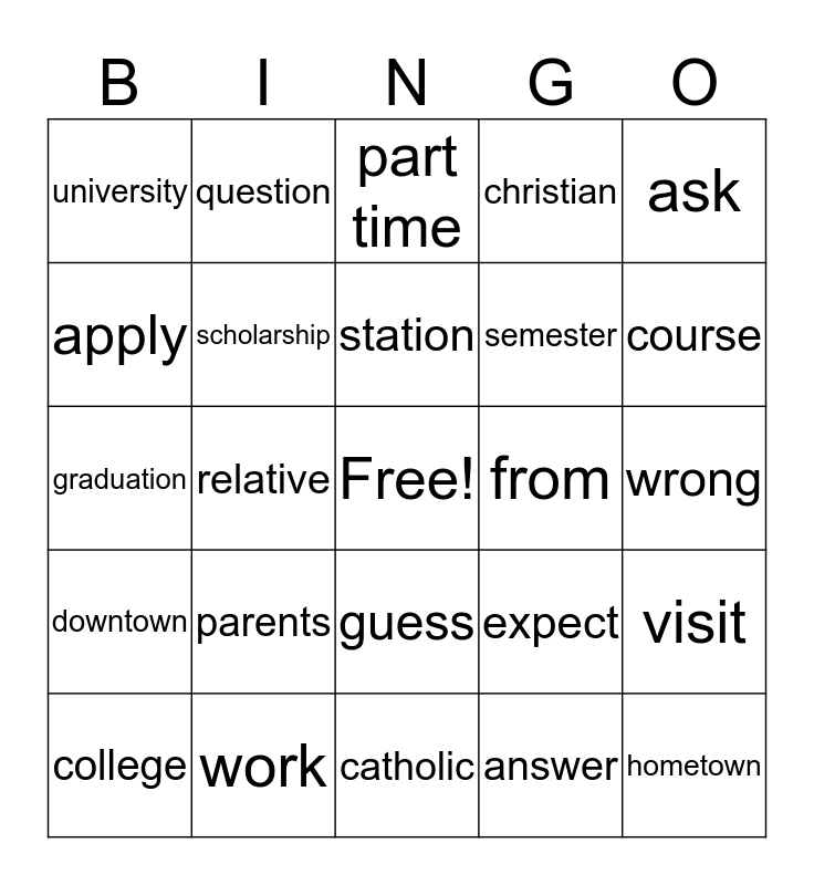 This bingo card has a free space and 24 words: parents, work, station, college, ask, university, apply, question, from, guess, semester, graduation, expect, visit, scholarship, answer, wrong, part time, course, relative, hometown, downtown, christian and catholic.