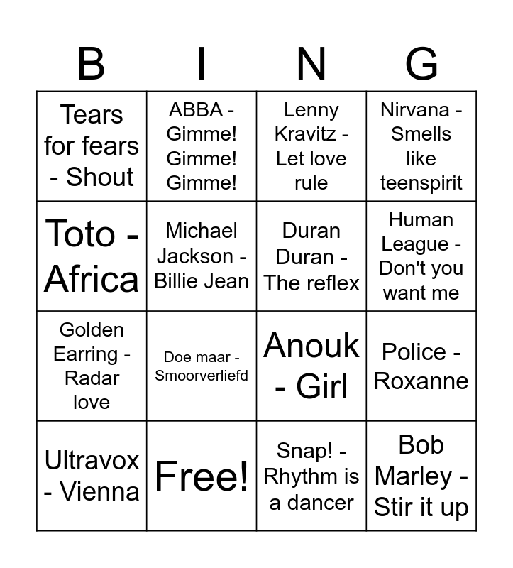This bingo card has 28 words: A-Ha - Take on me, De Dijk - Dansen op de vulkaan, Golden Earring - Radar love, Alanis Morissette - Ironic, Michael Jackson - Billie Jean, Lenny Kravitz - Let love rule, ABBA - Gimme! Gimme! Gimme!, Bob Marley - Stir it up, Free!, BeeGees - Stayin' alive, Anouk - Girl, Nirvana - Smells like teenspirit, Amy Winehouse - Valery, Coldplay - Fix you, Doe maar - Smoorverliefd, Adele - Rolling in the deep, Pearl Jam - Black, Duran Duran - The reflex, Human League - Don't you want me, Kate Bush - Cloudbusting, Tears for fears - Shout, UB40 - Red red wine, Ultravox - Vienna, Police - Roxanne, Snap! - Rhythm is a dancer, Snow patrol - Chasing cars, Toto - Africa and Bangles - Eternal flame.