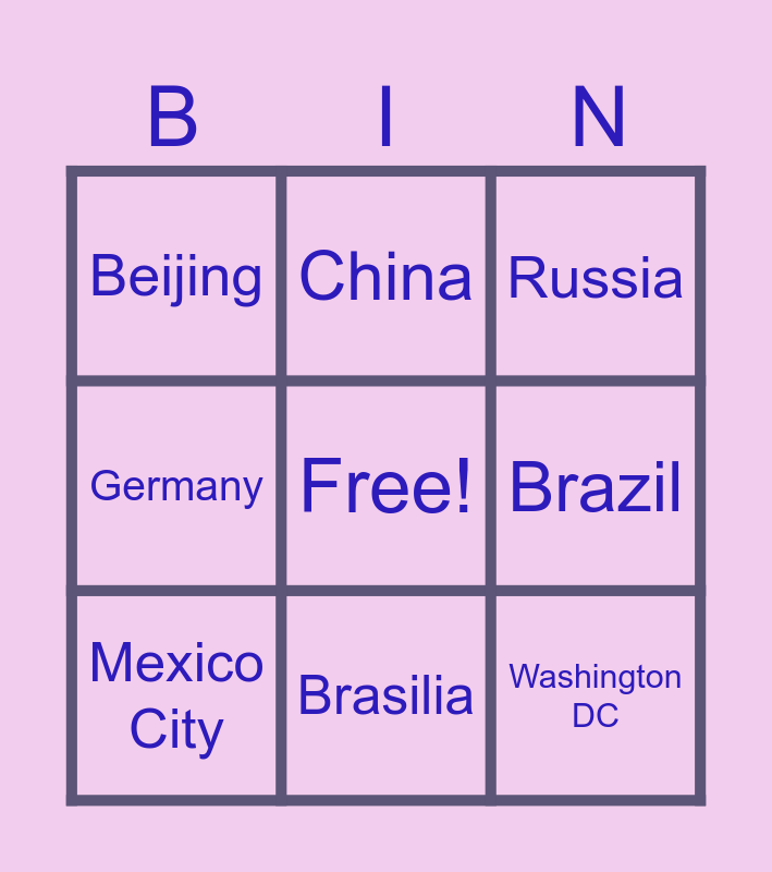 This bingo card has 1 images, a free space and 27 words: Canada, France, Mexico, Brazil, Russia, China, Australia, Japan, South Korea, Egypt, Germany, USA, Philippines, Bangkok, Ottawa, Paris, Mexico City, Brasilia, Moscow, Beijing, Canberra, Tokyo, Seoul, Cairo, Berlin, Washington DC and Manila.