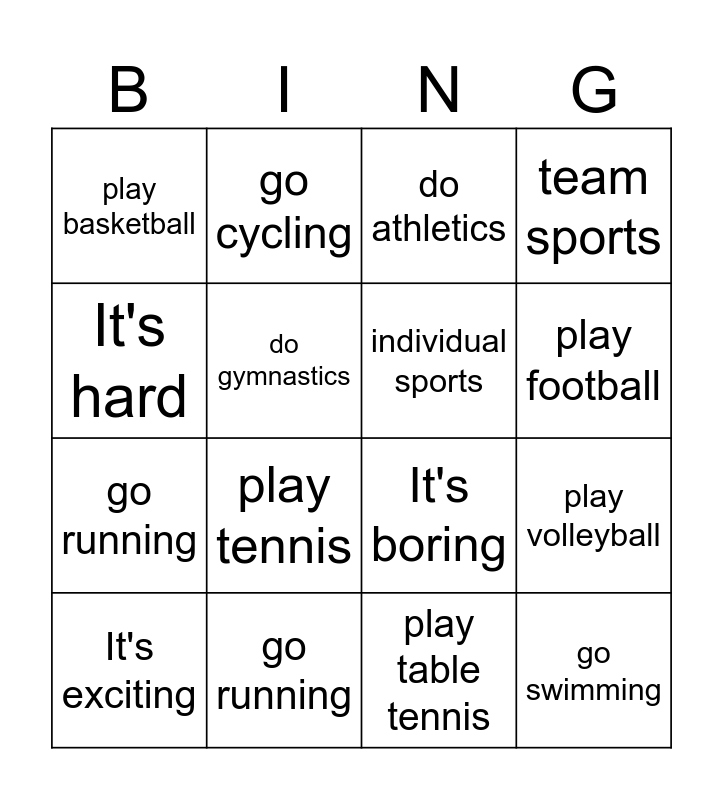 This bingo card has 18 words: play tennis, go swimming, do athletics, play basketball, It's boring, team sports, It's exciting, go cycling, play football, go running, play table tennis, It's hard, play volleyball, do gymnastics, individual sports, It's cool, go running and go swimming.