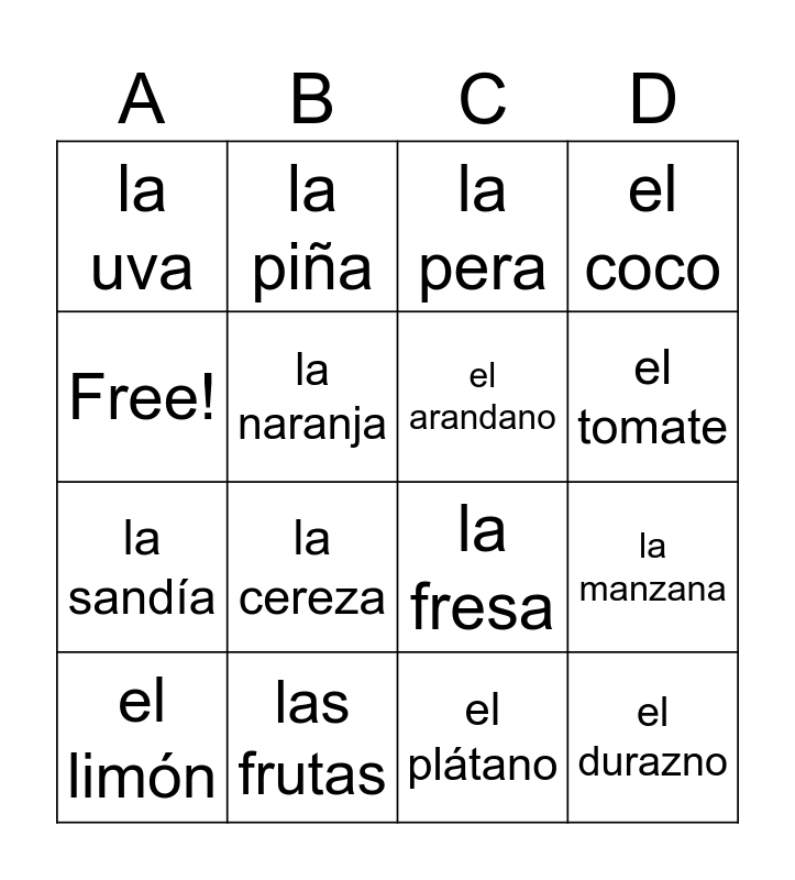 This bingo card has 16 words: las frutas, la manzana, la pera, la uva, la sandía, la piña, la fresa, el plátano, Free!, la naranja, el limón, el coco, la cereza, el tomate, el arandano and el durazno.