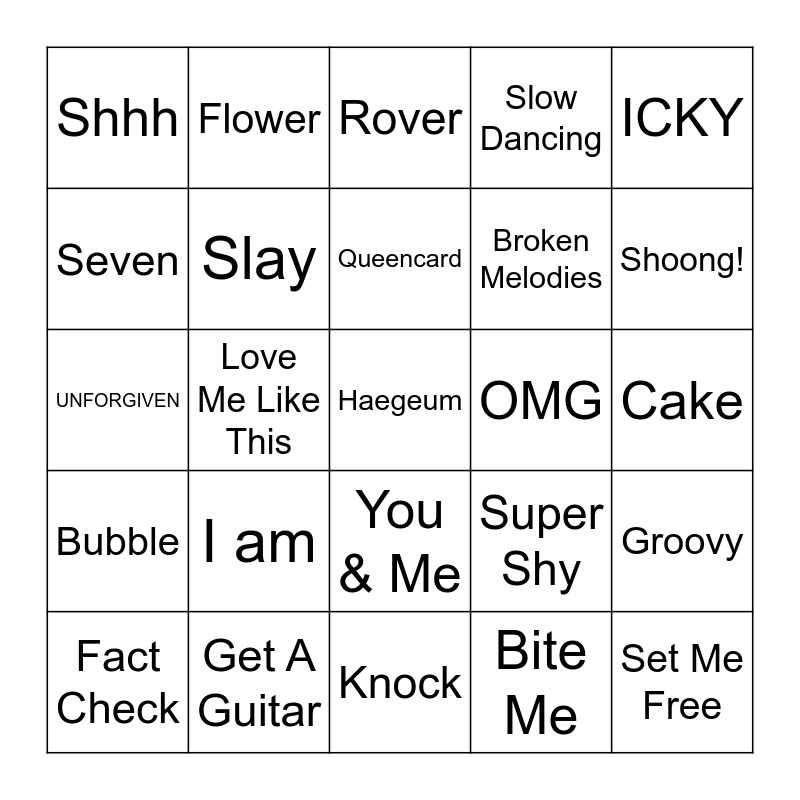 This bingo card has 25 words: I am, Knock, Queencard, Fact Check, ICKY, Shhh, Seven, Flower, OMG, You & Me, Broken Melodies, UNFORGIVEN, Super Shy, Groovy, Slay, Set Me Free, Cake, Rover, Shoong!, Love Me Like This, Haegeum, Get A Guitar, Bubble, Slow Dancing and Bite Me.