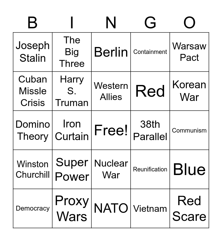 This bingo card has a free space and 24 words: Super Power, Proxy Wars, Western Allies, Democracy, Warsaw Pact, Joseph Stalin, Cuban Missle Crisis, The Big Three, 38th Parallel, Nuclear War, Red, Domino Theory, Reunification, Blue, Harry S. Truman, Vietnam, Communism, Berlin, Korean War, Iron Curtain, Red Scare, Winston Churchill, Containment and NATO.