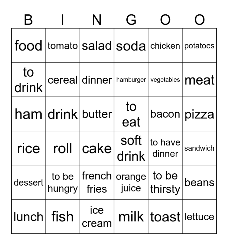 This bingo card has 42 words: toast, cereal, egg, bacon, sandwich, roll, ham, cheese, salad, pizza, butter, hamburger, meat, chicken, fish, rice, beans, vegetables, lettuce, tomato, potatoes, french fries, dessert, food, breakfast, lunch, dinner, vegetarian, to be hungry, to be thirsty, to take, to eat, to drink, to have dinner, ice cream, cake, soft drink, drink, orange juice, milk, soda and water.