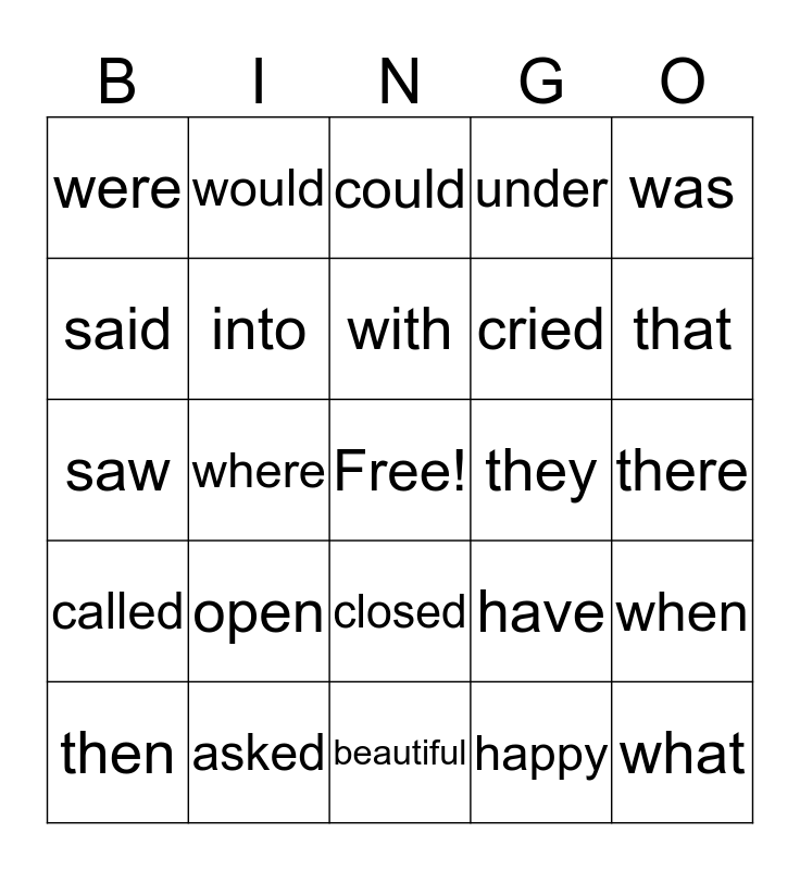 This bingo card has a free space and 24 words: open, asked, with, then, was, were, said, would, they, closed, cried, saw, have, when, into, happy, there, could, that, where, what, called, under and beautiful.