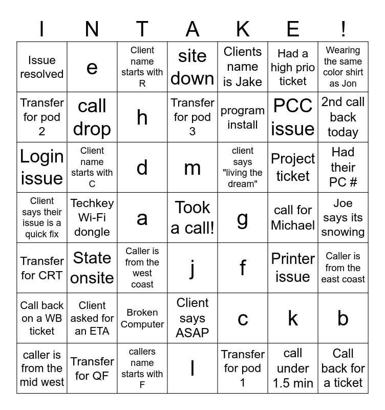 This bingo card has a free space and 55 words: Transfer for pod 1, Had their PC #, Bitlocker issue, Issue resolved, Techkey Wi-Fi dongle, Client asked for an ETA, Wearing the same color shirt as Jon, Call back for a PTO tech, call drop, Broken Computer, site down, Caller is from the east coast, Joe says its snowing, call for Michael, caller is from the mid west, Transfer for CRT, Clients name is Jake, program install, call under 1.5 min, PCC issue, 2nd call back today, State onsite, client says "living the dream", Client name starts with R, had a low prio ticket, Transfer for pod 2, a, cant find their PC #, Login issue, Project ticket, Call for CRT, Printer issue, b, Transfer for QF, Had a high prio ticket, Transfer for pod 3, Call back on a WB ticket, Client name starts with C, Call back for a ticket, Caller is from the west coast, e, Client says ASAP, c, Issue with MFA, d, Client says their issue is a quick fix, callers name starts with F, f, g, h, j, k, l, m and n.