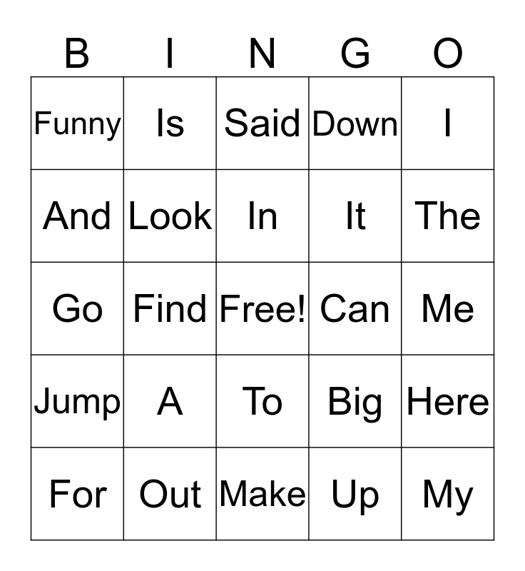 This bingo card has a free space and 24 words: A, Out, In, For, I, Funny, And, Is, Can, To, It, Go, Big, Here, Look, Up, Me, Said, The, Find, My, Jump, Down and Make.