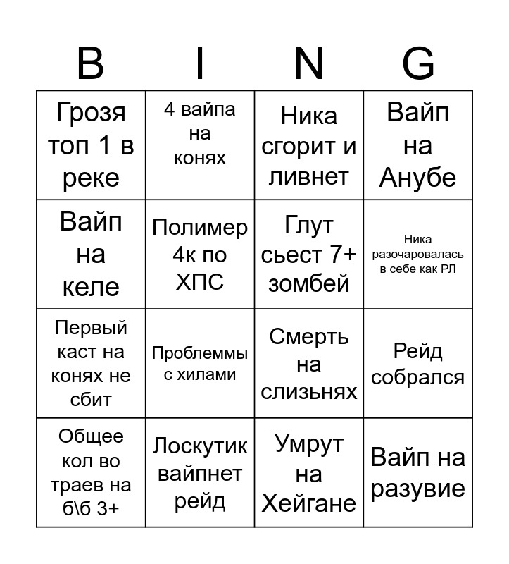 This bingo card has 16 words: Лоскутик вайпнет рейд, Рейд собрался, Ника сгорит и ливнет, Грозя топ 1 в реке, Первый каст на конях не сбит, 4 вайпа на конях, Смерть на слизьнях, Умрут на Хейгане, Вайп на келе, Полимер 4к по ХПС, Общее кол во траев на б\б 3+, Вайп на Анубе, Проблеммы с хилами, Ника разочаровалась в себе как РЛ, Глут сьест 7+ зомбей and Вайп на разувие.