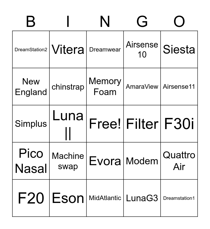 This bingo card has a free space and 29 words: F20, Humidifier, Luna ||, Airmini, DreamStation2, Dreamwear, chinstrap, Machine swap, Filter, Eson, F30i, Dreamstation1, MidAtlantic, LunaG3, Airsense11, P10, Evora, Pico Nasal, Siesta, Simplus, Modem, Rainout, AmaraView, New England, Airsense 10, Vitera, Quattro Air, Memory Foam and Cushion.