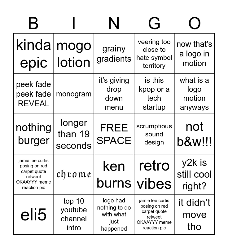 This bingo card has a free space and 25 words: 𝔠𝔥𝔯𝔬𝔪𝔢, logo had nothing to do with what just happened, it’s giving drop down menu, eli5, now that’s a logo in motion, kinda epic, peek fade peek fade REVEAL, mogo lotion, scrumptious sound design, ken burns, is this kpop or a tech startup, nothing burger, retro vibes, y2k is still cool right?, monogram, void, not b&w!!!, grainy gradients, what is a logo motion anyways, longer than 19 seconds, it didn’t move tho, top 10 youtube channel intro, jamie lee curtis posing on red carpet quote retweet OKAAYYY meme reaction pic, veering too close to hate symbol territory and jamie lee curtis posing on red carpet quote retweet OKAAYYY meme reaction pic.