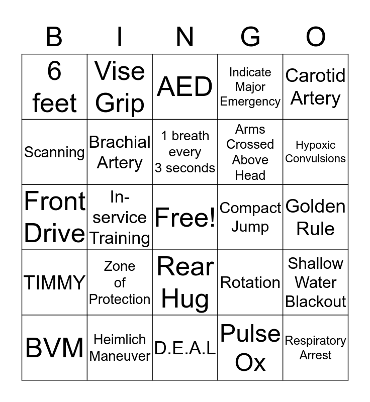 This bingo card has a free space and 24 words: Zone of Protection, Heimlich Maneuver, 1 breath every 3 seconds, BVM, Carotid Artery, 6 feet, Scanning, Vise Grip, Compact Jump, Rear Hug, Arms Crossed Above Head, Front Drive, Rotation, Shallow Water Blackout, Brachial Artery, Pulse Ox, Golden Rule, AED, Hypoxic Convulsions, In-service Training, Respiratory Arrest, TIMMY, Indicate Major Emergency and D.E.A.L.