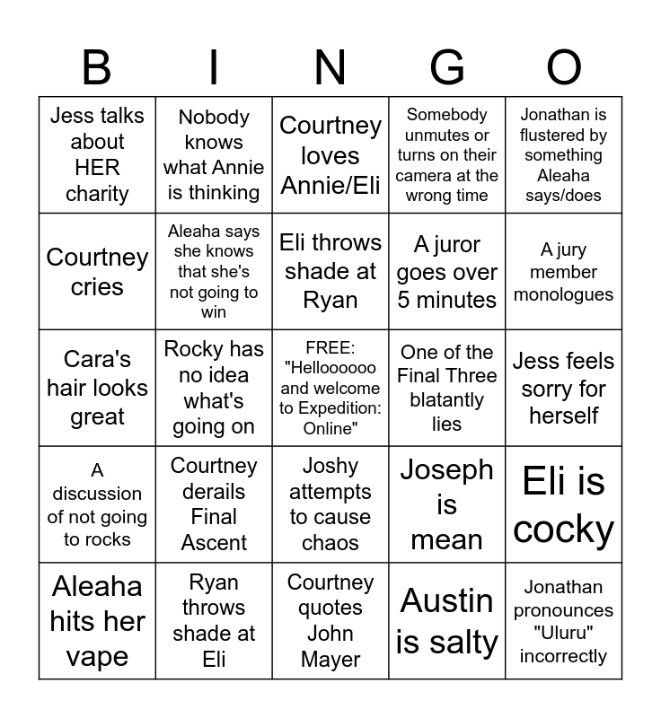 This bingo card has a free space and 24 words: Courtney derails Final Ascent, Ryan throws shade at Eli, Eli throws shade at Ryan, Aleaha hits her vape, Jonathan is flustered by something Aleaha says/does, Jess talks about HER charity, Courtney cries, Nobody knows what Annie is thinking, One of the Final Three blatantly lies, Joshy attempts to cause chaos, A juror goes over 5 minutes, Cara's hair looks great, Joseph is mean, Eli is cocky, Aleaha says she knows that she's not going to win, Austin is salty, Jess feels sorry for herself, Courtney loves Annie/Eli, A jury member monologues, Rocky has no idea what's going on, Jonathan pronounces "Uluru" incorrectly, A discussion of not going to rocks, Somebody unmutes or turns on their camera at the wrong time and Courtney quotes John Mayer.