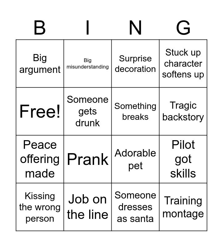 This bingo card has 16 words: Job on the line, Pilot got skills, Surprise decoration, Big argument, Peace offering made, Big misunderstanding, Adorable pet, Someone dresses as santa, Free!, Someone gets drunk, Kissing the wrong person, Stuck up character softens up, Prank, Tragic backstory, Something breaks and Training montage.