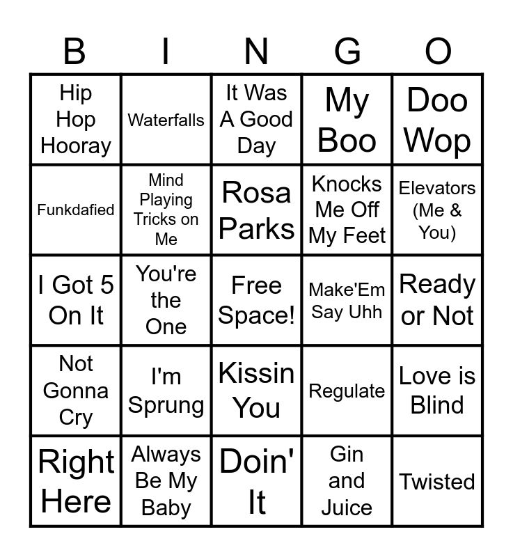 This bingo card has a free space and 24 words: Right Here, I'm Sprung, Rosa Parks, Gin and Juice, Doo Wop, Hip Hop Hooray, Waterfalls, It Was A Good Day, Make'Em Say Uhh, Ready or Not, I Got 5 On It, Mind Playing Tricks on Me, Regulate, Love is Blind, Funkdafied, Always Be My Baby, Doin' It, My Boo, Elevators (Me & You), Not Gonna Cry, You're the One, Kissin You, Knocks Me Off My Feet and Twisted.