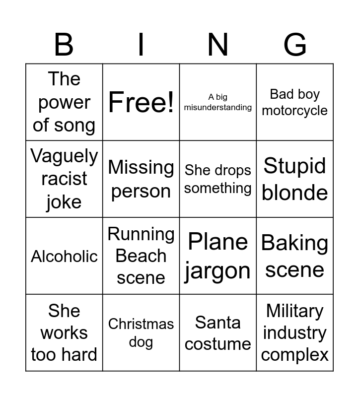 This bingo card has 19 words: Plane jargon, Plane crash, A big misunderstanding, Military industry complex, Baking scene, Vaguely racist joke, Santa costume, The power of song, Free!, Alcoholic, Running Beach scene, Missing person, She drops something, Christmas dog, She works too hard, Misogyny, Bad boy motorcycle, Stupid blonde and Humbug.