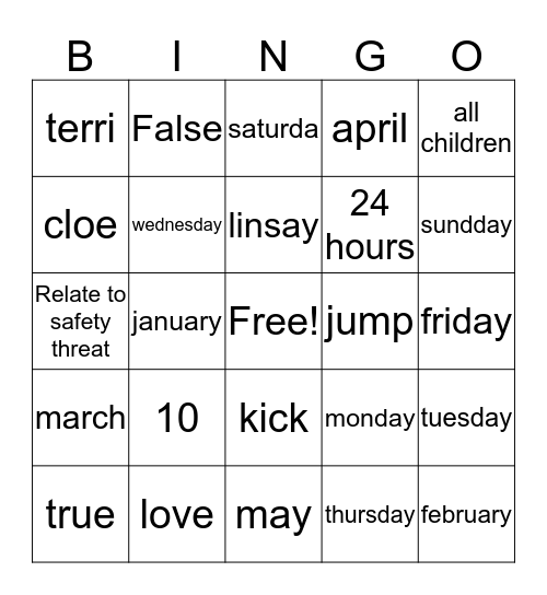 This bingo card has a free space and 24 words: 10, love, linsay, true, all children, terri, cloe, False, jump, kick, 24 hours, Relate to safety threat, monday, tuesday, wednesday, thursday, friday, saturda, sundday, january, february, march, april and may.