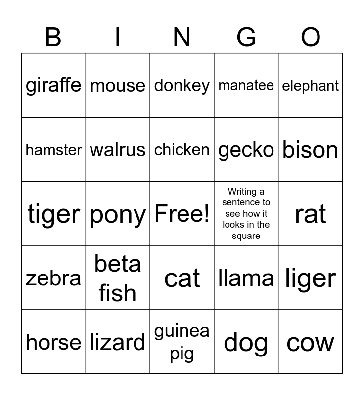 This bingo card has a free space and 26 words: cat, dog, chicken, lizard, elephant, giraffe, hamster, mouse, rat, llama, gecko, tiger, liger, horse, pony, unicorn, manatee, zebra, donkey, cow, bison, guinea pig, Writing a sentence to see how it looks in the square, beta fish, walrus and sloth.