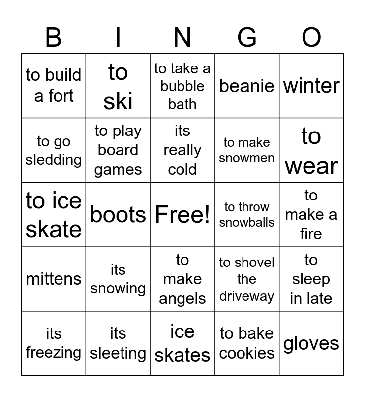 This bingo card has a free space and 24 words: its snowing, its sleeting, its really cold, its freezing, winter, to build a fort, to go sledding, to ski, to throw snowballs, to make angels, to make snowmen, to ice skate, to shovel the driveway, to sleep in late, to play board games, to bake cookies, to make a fire, to take a bubble bath, to wear, boots, gloves, mittens, beanie and ice skates.