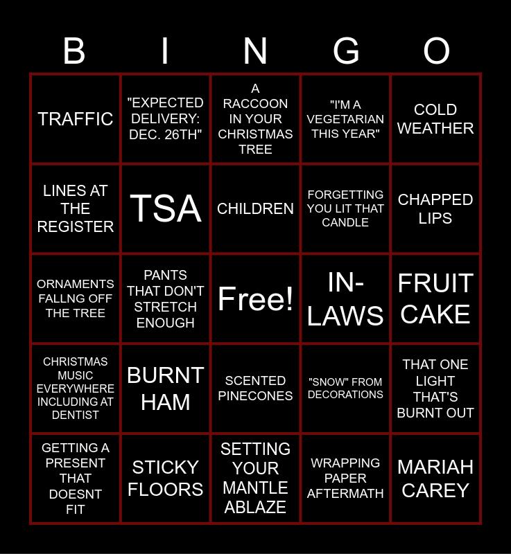 This bingo card has a free space and 24 words: BURNT HAM, STICKY FLOORS, CHILDREN, GETTING A PRESENT THAT DOESNT FIT, COLD WEATHER, TRAFFIC, LINES AT THE REGISTER, "EXPECTED DELIVERY: DEC. 26TH", IN-LAWS, SCENTED PINECONES, FORGETTING YOU LIT THAT CANDLE, ORNAMENTS FALLNG OFF THE TREE, "SNOW" FROM DECORATIONS, THAT ONE LIGHT THAT'S BURNT OUT, TSA, WRAPPING PAPER AFTERMATH, FRUIT CAKE, A RACCOON IN YOUR CHRISTMAS TREE, CHAPPED LIPS, PANTS THAT DON'T STRETCH ENOUGH, MARIAH CAREY, CHRISTMAS MUSIC EVERYWHERE INCLUDING AT DENTIST, "I'M A VEGETARIAN THIS YEAR" and SETTING YOUR MANTLE ABLAZE.