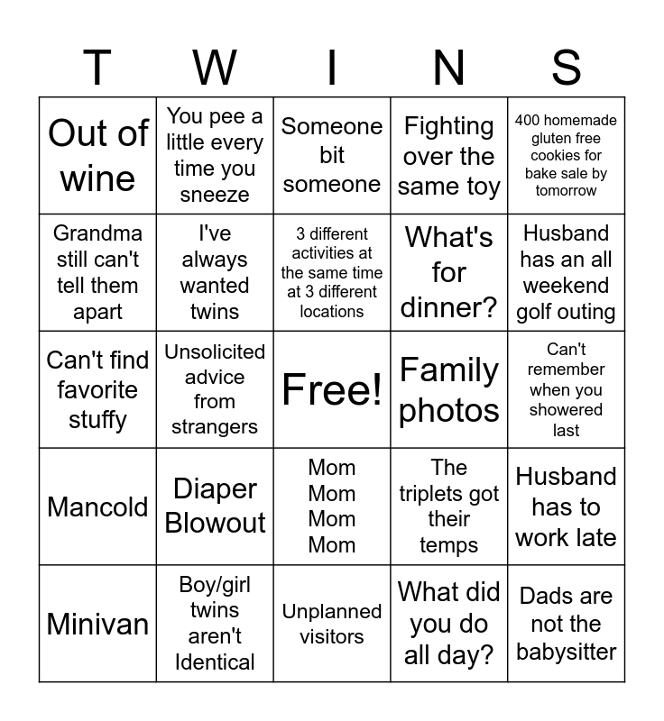 This bingo card has a free space and 29 words: Minivan, Mother in Law, Unsolicited advice from strangers, Door bell during nap, Out of wine, Someone bit someone, I've always wanted twins, Diaper Blowout, Family photos, Boy/girl twins aren't Identical, Can't remember when you showered last, Dads are not the babysitter, Unplanned visitors, What did you do all day?, Husband has an all weekend golf outing, The stomach bug is going around at school, Mom Mom Mom Mom, Mancold, 400 homemade gluten free cookies for bake sale by tomorrow, Can't find favorite stuffy, The triplets got their temps, Only one made the team, What's for dinner?, Grandma still can't tell them apart, Fighting over the same toy, You pee a little every time you sneeze, Husband has to work late, 3 different activities at the same time at 3 different locations and Double the trouble.