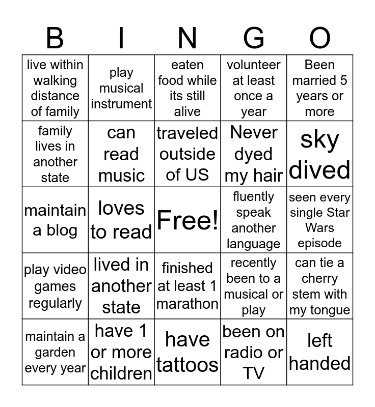 This bingo card has a free space and 24 words: lived in another state, have 1 or more children, traveled outside of US, maintain a garden every year, Been married 5 years or more, live within walking distance of family, family lives in another state, play musical instrument, fluently speak another language, finished at least 1 marathon, Never dyed my hair, maintain a blog, recently been to a musical or play, can tie a cherry stem with my tongue, can read music, been on radio or TV, seen every single Star Wars episode, eaten food while its still alive, sky dived, loves to read, left handed, play video games regularly, volunteer at least once a year and have tattoos.