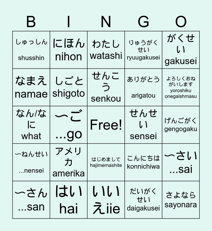 This bingo card has a free space and 24 words: アメリカ amerika, はい hai, せんこうsenkou, 〜さん ...san, がくせい gakusei, しゅっしん shusshin, なまえ namae, にほんnihon, せんせい sensei, はじめましてhajimemashite, ありがとう arigatou, なん/なに what, こんにちはkonnichiwa, 〜さい ...sai, しごとshigoto, だいがくせい daigakusei, げんごがく gengogaku, わたしwatashi, よろしくおねがいします yoroshiku onegaishmasu, 〜ご ...go, さよなら sayonara, 〜ねんせい ...nensei, りゅうがくせい ryuugakusei and いいえiie.