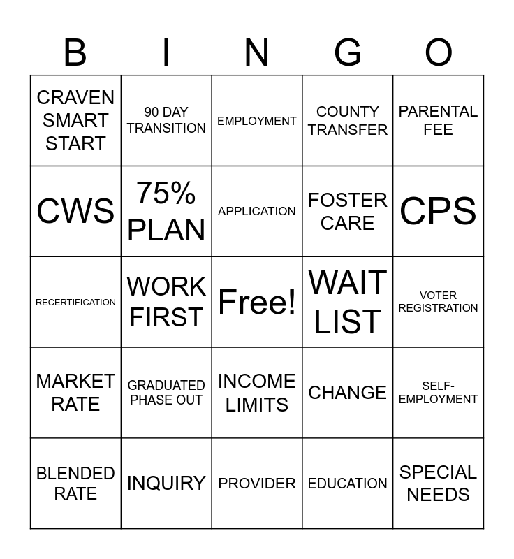 This bingo card has a free space and 24 words: GRADUATED PHASE OUT, INQUIRY, APPLICATION, BLENDED RATE, PARENTAL FEE, CRAVEN SMART START, CWS, 90 DAY TRANSITION, WAIT LIST, INCOME LIMITS, FOSTER CARE, RECERTIFICATION, CHANGE, SELF-EMPLOYMENT, 75% PLAN, EDUCATION, VOTER REGISTRATION, EMPLOYMENT, CPS, WORK FIRST, SPECIAL NEEDS, MARKET RATE, COUNTY TRANSFER and PROVIDER.