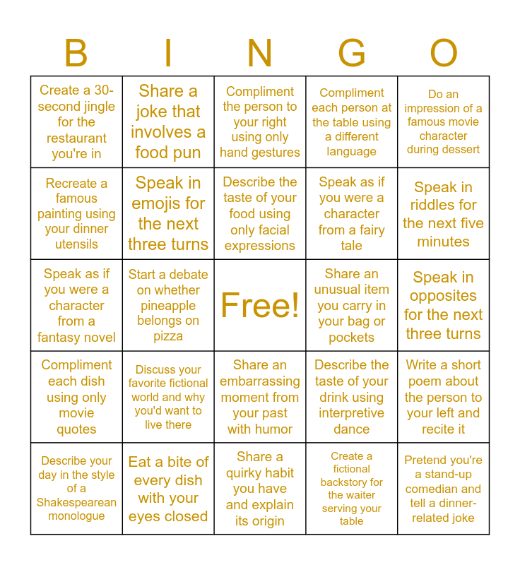 This bingo card has a free space and 70 words: Swap accessories with someone across the table, Speak in opposites for the next three turns, Share a fun and fictional superpower you wish you had, Convince the group you have a celebrity look-alike, Eat a bite of every dish with your eyes closed, Share a wild travel adventure, whether true or fictional, Compliment each person at the table using a different language, Pretend you're a news anchor reporting on the dinner event, Do an impression of a famous movie character during dessert, Share a guilty pleasure song and sing a snippet for the group, Write a short poem about the person to your left and recite it, Discuss your dream dinner party guest list, living or deceased, Create a 30-second jingle for the restaurant you're in, Compliment the person to your right using only hand gestures, Share a quirky talent you possess and demonstrate it, Start a debate on whether pineapple belongs on pizza, Share an embarrassing moment from your past with humor, Speak as if you were a character from a fairy tale, Pretend you're a food critic and review each course in detail, Compliment each dish using only movie quotes, Share an unusual item you carry in your bag or pockets, Describe the taste of your drink using interpretive dance, Speak in riddles for the next five minutes, Create a haiku about the dinner experience, Share a funny pet story, real or imagined, Swap seats with someone diagonally across the table, Give a dramatic reading of the table settings, Share a strange dream you've had recently, Create a fictional backstory for the waiter serving your table, Speak in a foreign accent for the remainder of the dinner, Share a joke that involves a food pun, Discuss your favorite childhood cartoon character, Compliment the chef using only facial expressions, Share a random fact about each person at the table, Speak as if you were narrating a documentary about the dinner, Swap names with someone and continue the conversation, Discuss the current dinner as if it were a suspenseful thriller, Share a quote from your favorite movie or book, Speak in third person for the next five minutes, Recreate a famous painting using your dinner utensils, Share a weird food combination you enjoy, Discuss your favorite fictional world and why you'd want to live there, Pretend you're a stand-up comedian and tell a dinner-related joke, Give a weather report for an imaginary location, Share a funny family tradition or inside joke, Speak in emojis for the next three turns, Describe your day in the style of a Shakespearean monologue, Convince the group you have a secret talent and reveal it, Share a fun fact about each person's astrological sign, Speak as if you were a character from a different era, Recite a short tongue twister, Share an interesting piece of trivia about the restaurant's history, Compliment each dish using exaggerated body language, Pretend you're a sports commentator narrating the dinner, Share a quirky habit you have and explain its origin, Speak in song lyrics for the next three turns, Describe the taste of your food using only facial expressions, Share a conspiracy theory about the origins of a popular dish, Discuss your dream job if you were in a different time period, Pretend you're a detective solving a culinary mystery, Speak as if you were a character from a fantasy novel, Share a funny misunderstanding you've had in the past, Compliment each dish using exaggerated gestures, Create a short, impromptu rap about the dinner, Discuss your favorite childhood board game, Share an interesting fact about your hometown, Pretend you're a travel blogger describing the dinner experience, Speak in an accent of your choice for the next five minutes, Share a memorable quote from a family member or friend and Conclude the dinner with a toast using a made-up language.