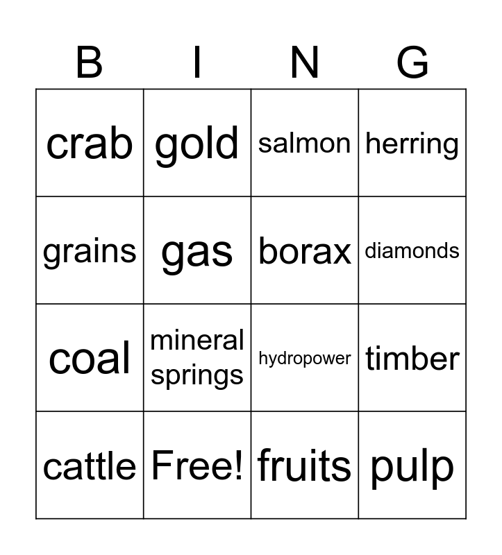 This bingo card has 16 words: Free!, timber, salmon, crab, coal, gold, hydropower, fruits, grains, gas, cattle, herring, mineral springs, diamonds, borax and pulp.
