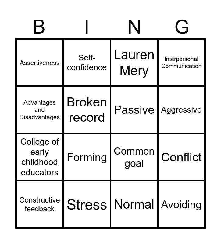 This bingo card has 16 words: Stress, Conflict, Lauren Mery, Assertiveness, College of early childhood educators, Self-confidence, Common goal, Normal, Advantages and Disadvantages, Broken record, Constructive feedback, Interpersonal Communication, Forming, Aggressive, Passive and Avoiding.
