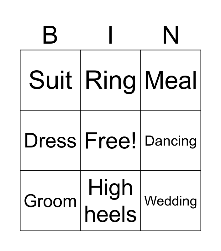 This bingo card has a free space and 14 words: Helen, Veil, Groom, Ring, Dress, Wedding, Bride, Nick, High heels, Suit, Flowers, Dancing, Meal and Tiara.