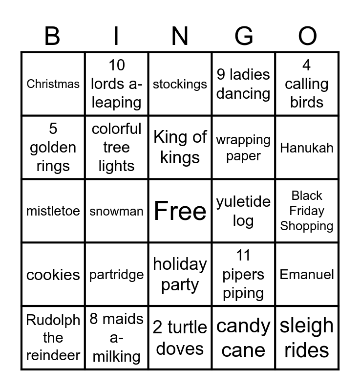 This bingo card has a free space and 29 words: Rudolph the reindeer, roasted nuts, snowman, 12 drummers drumming, Christmas, stockings, colorful tree lights, partridge, yuletide log, 8 maids a-milking, Black Friday Shopping, sleigh rides, 2 turtle doves, candy cane, Hanukah, 3 french hens, holiday party, cookies, 4 calling birds, mistletoe, 11 pipers piping, 6 geese a-laying, wrapping paper, 5 golden rings, 9 ladies dancing, 10 lords a-leaping, Emanuel, King of kings and Lord of lords.
