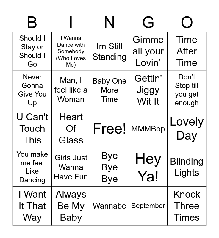 This bingo card has a free space and 24 words: Girls Just Wanna Have Fun, Always Be My Baby, Baby One More Time, I Want It That Way, Time After Time, Should I Stay or Should I Go, Never Gonna Give You Up, I Wanna Dance with Somebody (Who Loves Me), MMMBop, Bye Bye Bye, Gettin' Jiggy Wit It, U Can't Touch This, Hey Ya!, Blinding Lights, Man, I feel like a Woman, September, Lovely Day, Im Still Standing, Don’t Stop till you get enough, Heart Of Glass, Knock Three Times, You make me feel Like Dancing, Gimme all your Lovin’ and Wannabe.