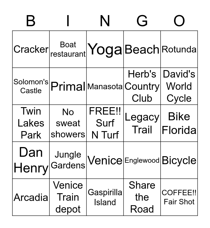 This bingo card has a free space and 24 words: Jungle Gardens, Venice Train depot, Manasota, Arcadia, Rotunda, Cracker, Solomon's Castle, Boat restaurant, Legacy Trail, Venice, Herb's Country Club, Twin Lakes Park, Englewood, Bicycle, Primal, Share the Road, Bike Florida, Yoga, David's World Cycle, No sweat showers, COFFEE!! Fair Shot, Dan Henry, Beach and Gaspirilla Island.