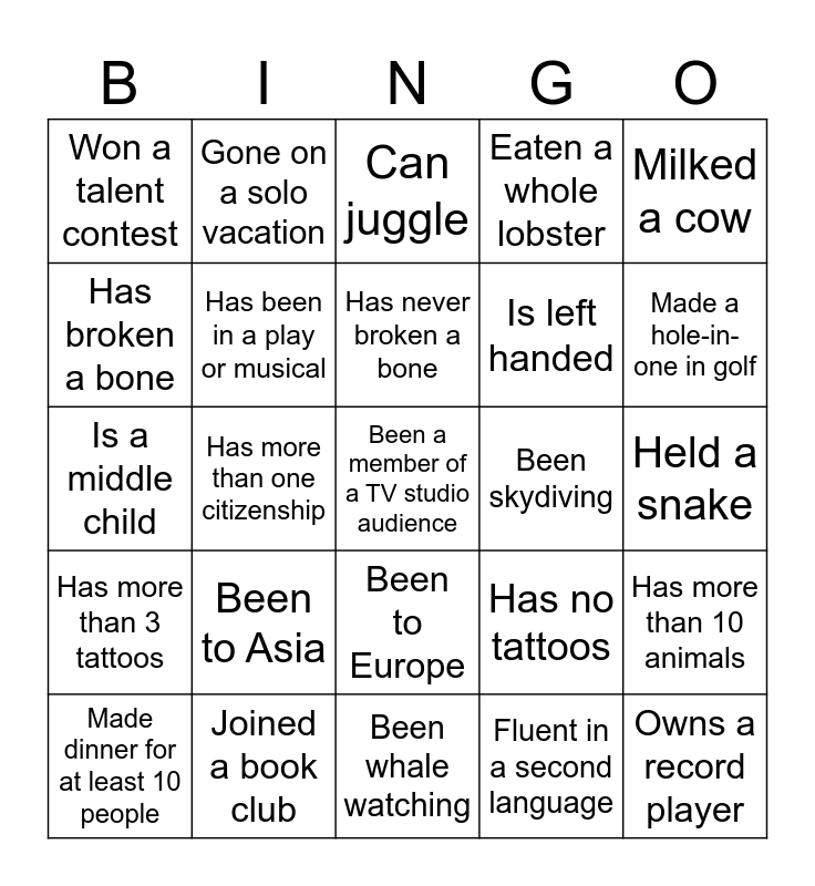 This bingo card has 43 words: Free!, Been a member of a TV studio audience, Ridden a snowmobile, Made dinner for at least 10 people, Invested in a startup, Fluent in a second language, Can juggle, Won a radio call-in, Milked a cow, Joined a book club, Eaten a whole lobster, Been skydiving, Been to Europe, Been to Asia, Hugged a Redwood tree, Been whale watching, Been to a rodeo, Is a middle child, Shared a cab with a stranger, Made a hole-in-one in golf, Gone on a solo vacation, Had a crush on a cartoon character, Gotten stitches, Won a talent contest, Waved at a stranger because you thought they were waving at you, Held a snake, Seen a total eclipse, Pretended to have an accent, Has no tattoos, Has more than 3 tattoos, Has exactly 3 children, Has more than 10 animals, Lived in at least 3 states, Has more than one citizenship, Lived in the same state their whole life, Has an uncommon pet, Owns a record player, Has never broken a bone, Has broken a bone, Is left handed, Played a sport in high school, Has been in a play or musical and Been scuba diving.