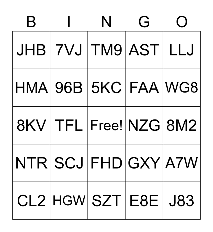 This bingo card has a free space and 24 words: SCJ, HGW, 5KC, CL2, LLJ, JHB, HMA, 7VJ, NZG, FHD, FAA, 8KV, GXY, A7W, 96B, E8E, 8M2, TM9, WG8, TFL, J83, NTR, AST and SZT.