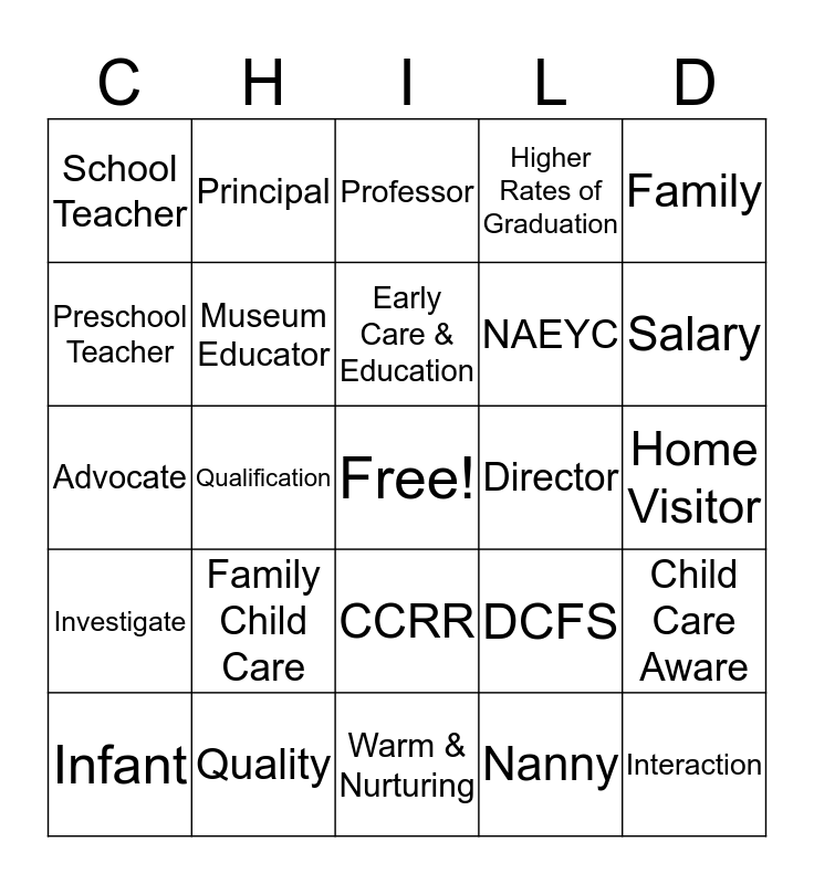 This bingo card has a free space and 24 words: Family Child Care, Quality, Early Care & Education, Infant, Family, School Teacher, Preschool Teacher, Principal, Director, CCRR, NAEYC, Advocate, DCFS, Child Care Aware, Museum Educator, Nanny, Home Visitor, Professor, Salary, Qualification, Interaction, Investigate, Higher Rates of Graduation and Warm & Nurturing.