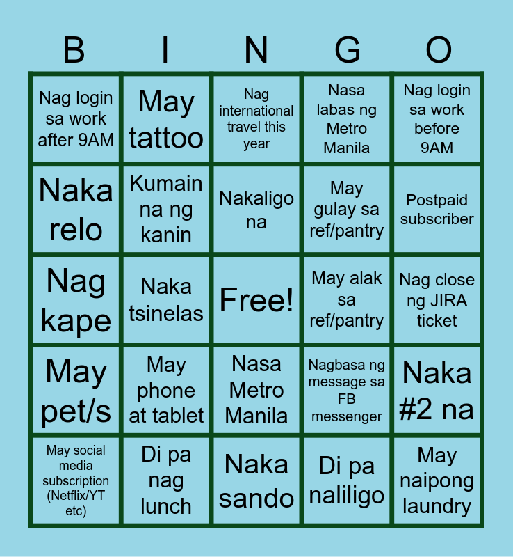 This bingo card has a free space and 28 words: Nag lunch na, Di pa nag lunch, Nag international travel this year, Nag domestic travel this year, Nag login sa work before 9AM, Nag login sa work after 9AM, Kumain na ng kanin, Nakaligo na, Nagbasa ng message sa FB messenger, Nag close ng JIRA ticket, Nag kape, Naka tsinelas, Di pa naliligo, Naka #2 na, Naka relo, May gatas sa ref/pantry, Naka sando, May gulay sa ref/pantry, Postpaid subscriber, May social media subscription (Netflix/YT etc), May tattoo, May stock na non-white rice, May alak sa ref/pantry, May pet/s, May phone at tablet, Nasa Metro Manila, Nasa labas ng Metro Manila and May naipong laundry.